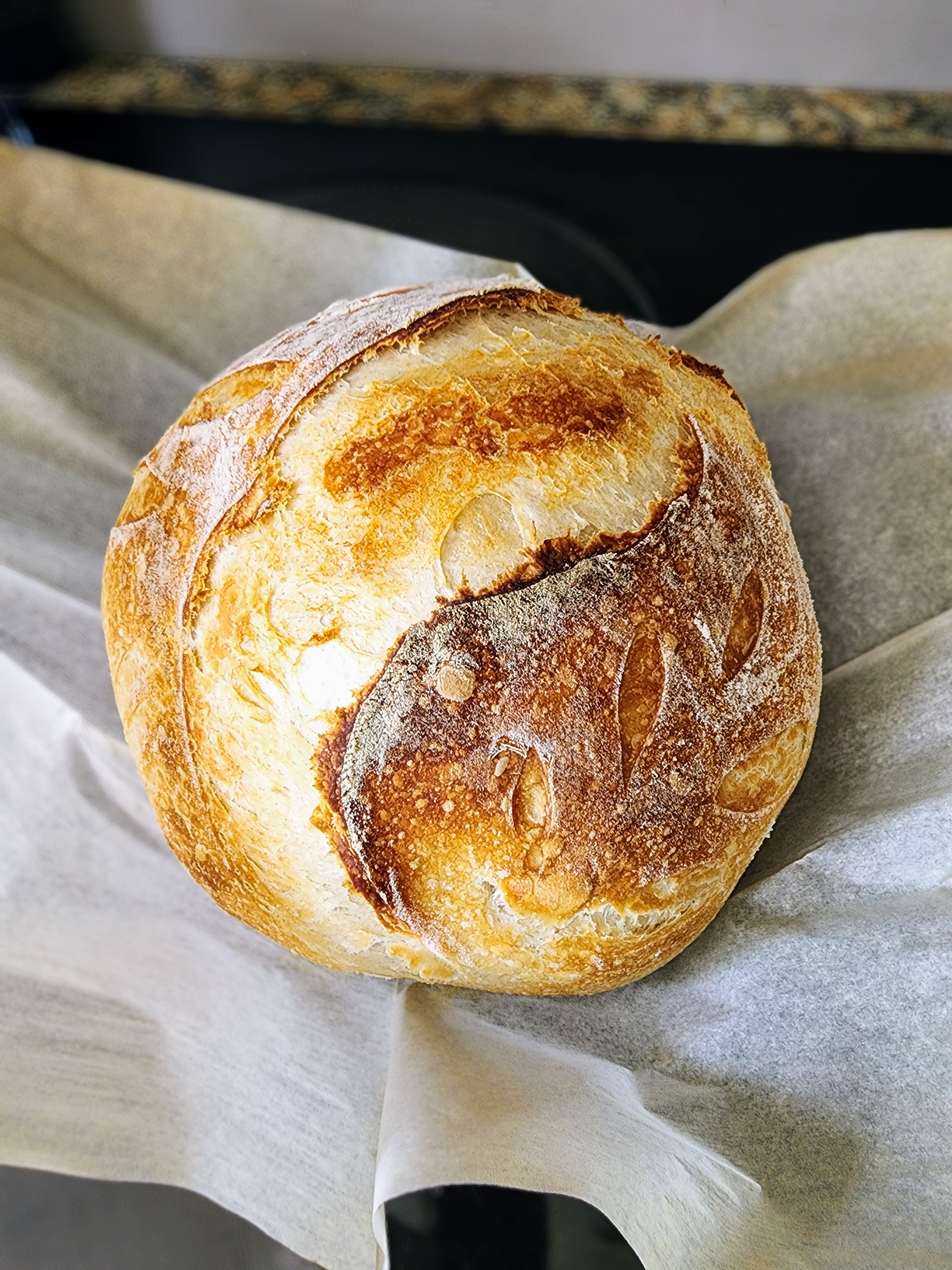 After dumping it out of the Dutch oven post-bake, I immediately grabbed the wickedly hot loaf in both hands to test the crackle of the golden crust. I was disappointed to discover it comes out of the oven basically a bread boulder, hard as a rock. When sufficiently cooled, however, the crust was a lovely percussion of crackle.